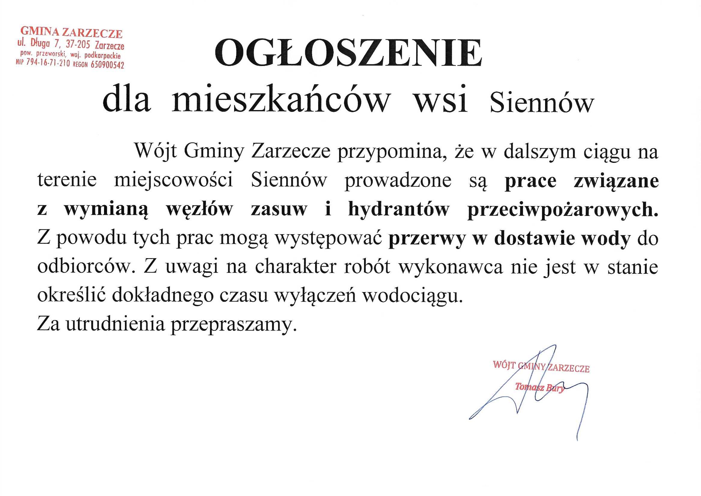 OGŁOSZENIE DLA MIESZKAŃCÓW WSI SIENNÓW
