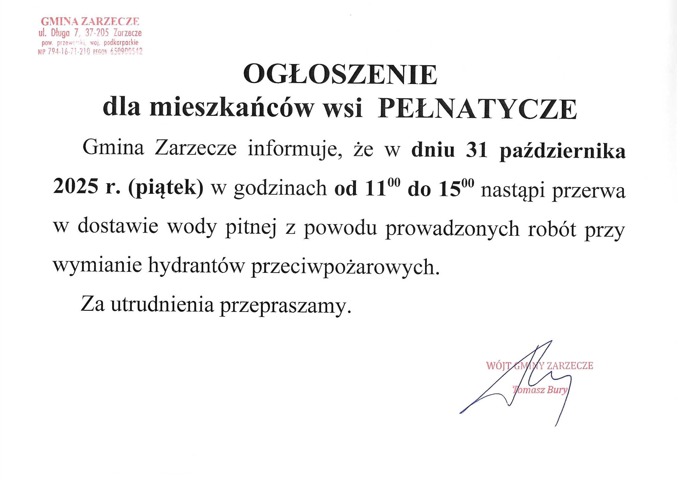 OGŁOSZENIE DLA MIESZKAŃCÓW WSI PEŁNATYCZE
